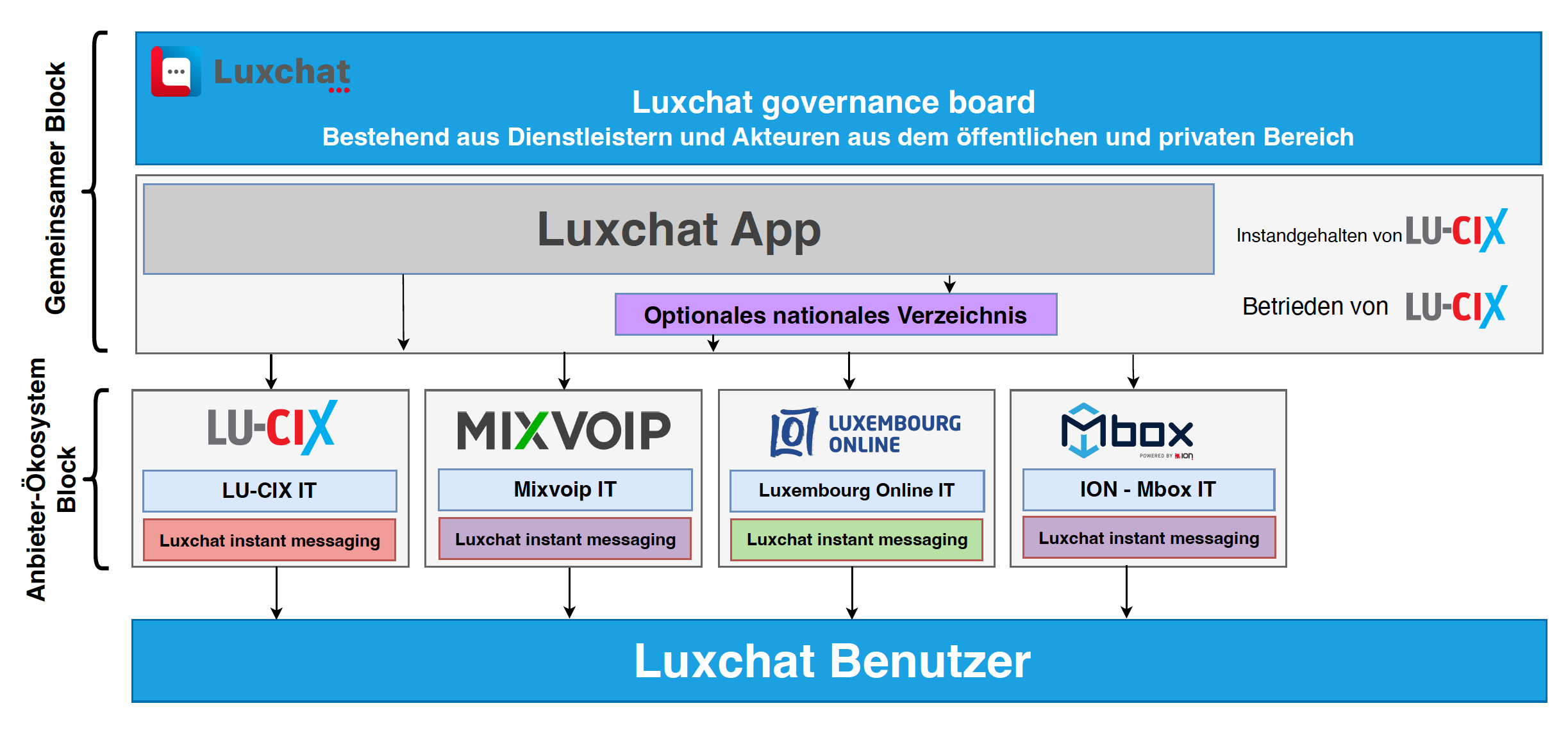 Das Ökosystem von Luxchat für die breite Öffentlichkeit und Unternehmen (Luxchat) besteht aus mehreren Dienstleistern, die den Instant Messaging-Dienst Luxchat anbieten und dabei unter anderem die folgenden technischen, dienstlichen und rechtlichen Bedingungen einhalten und anwenden: